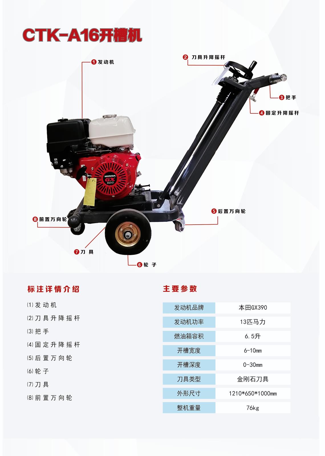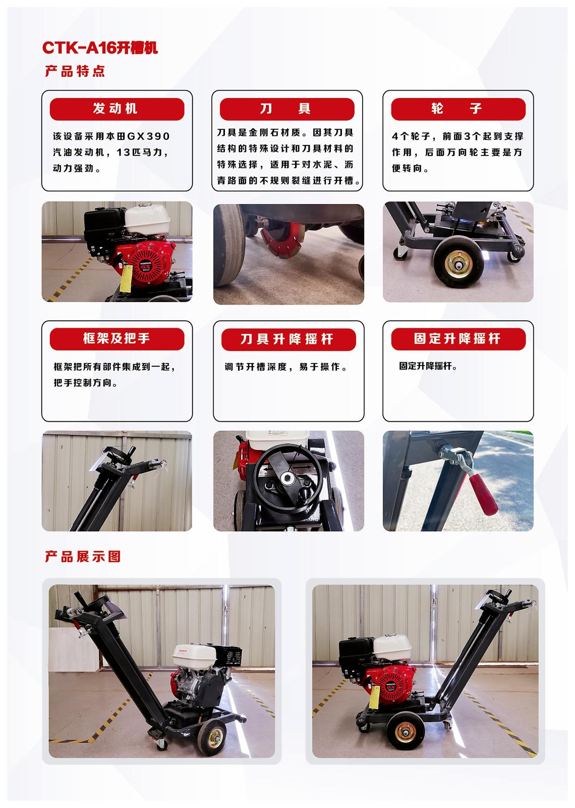 長泰公路在多次施工中總結(jié)經(jīng)驗,推出了全新版本的A16開槽機,向后拉的行走方式,方便施工人員針對不規(guī)則裂縫進行切割、開槽;開槽深度可調(diào)節(jié)0-30mm;全新輪胎設計,對縫方便,日均施工量可達5000米。